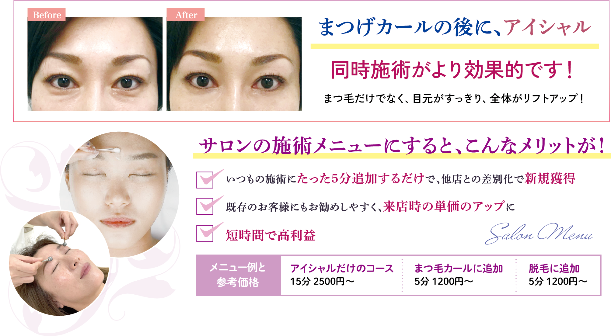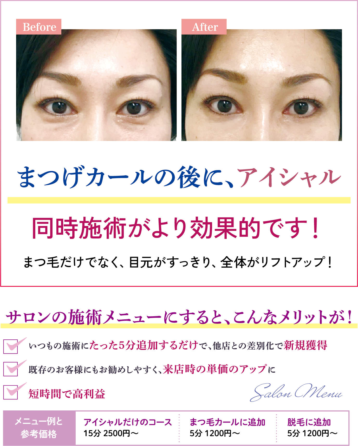 お顔のお手入れのフェイシャルを、アイゾーンに集中してケアするのが「アイシャル」です。目全体をオーガニックバームとリフトスティックでマッサージし、まぶたの弛みや目の周りの小じわ、重たく暗い目元、クマなどの悩みにアプローチします。まつ毛カールやエクステのオプションメニューとしてもおすすめです。